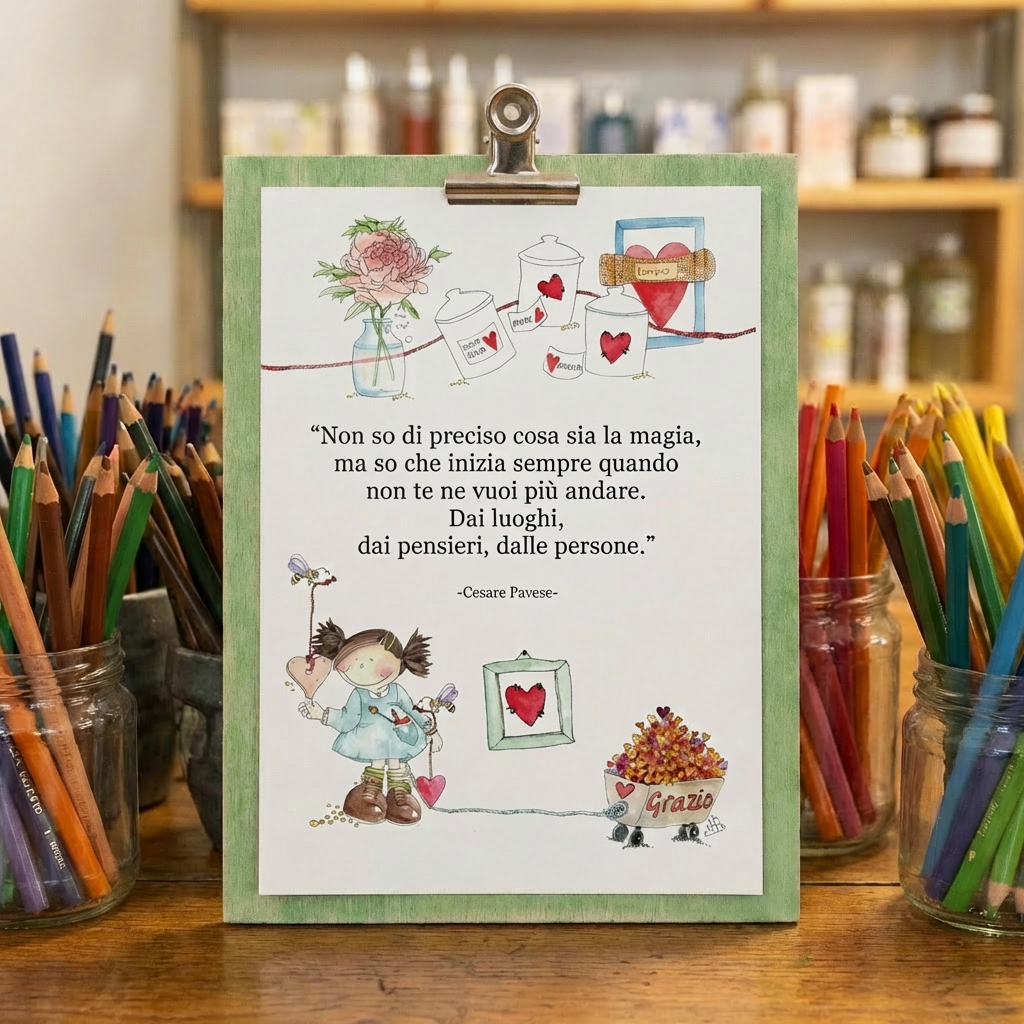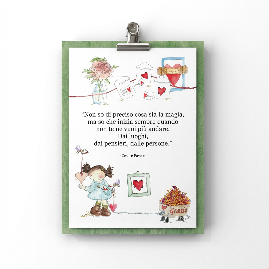 "Magia" - Un soffio di incanto quotidiano catturato dagli acquarelli. Il supporto in legno verde e la clip vintage racchiudono questa celebre citazione, pronta a trasformare ogni parete in un angolo di pura poesia.