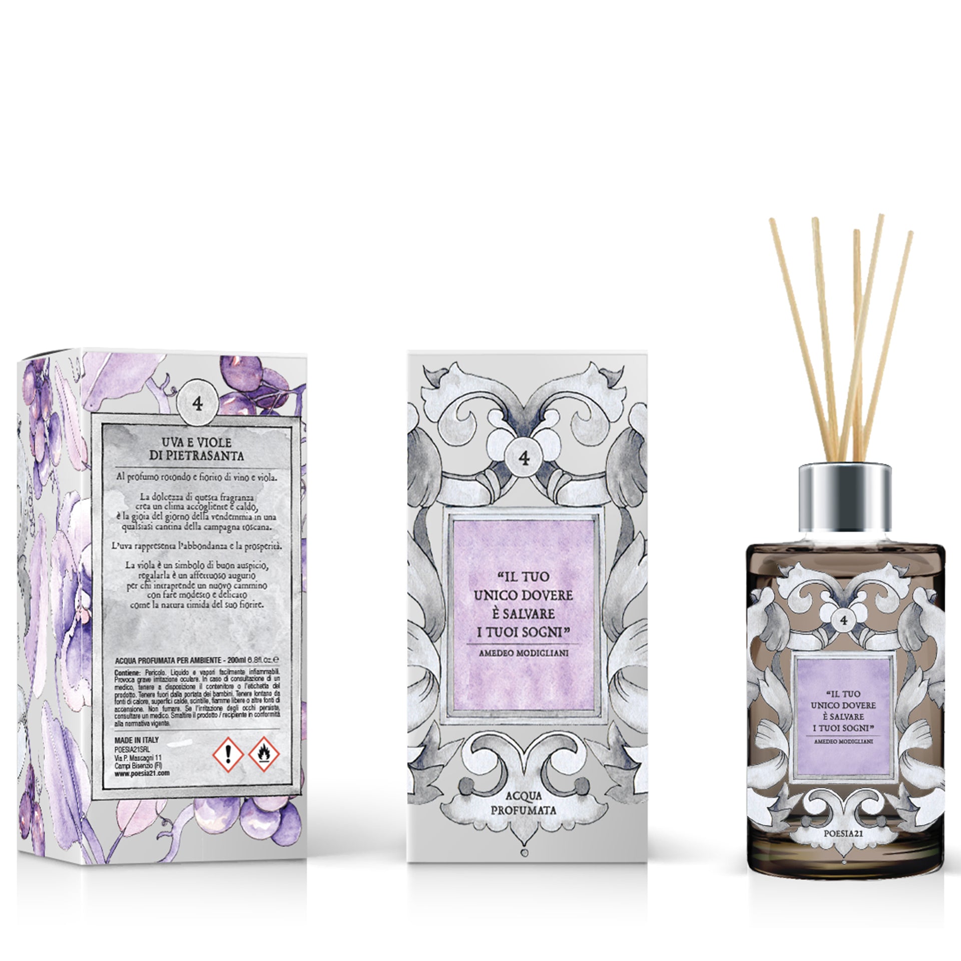 L’uva, simbolo di abbondanza e prosperità, racconta la ricchezza della natura e il piacere delle piccole cose. La viola, con la sua delicatezza, è da sempre un augurio di buon cammino: rappresenta la grazia, la modestia e la gentile forza di chi intraprende nuovi percorsi con fiducia e cuore aperto. Una fragranza dolce e avvolgente, perfetta per rendere ogni spazio più armonioso e pieno di calore.