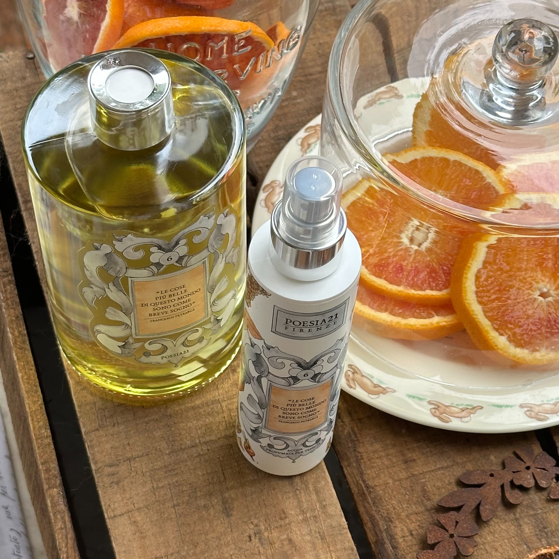 L’arancio dolce, da secoli presente nei giardini medicei di Firenze, simboleggia la vitalità e l’energia del sole, mentre l’ambra regala calore e morbidezza, trasformando ogni ambiente in un rifugio accogliente. È una carezza olfattiva che invita al relax e alla convivialità, perfetta per accogliere con dolcezza.