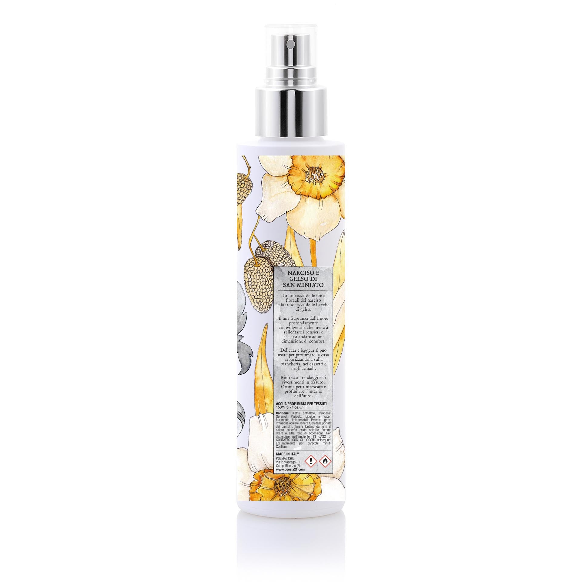 Il fiore del narciso, simbolo di rinascita e bellezza interiore, incontra la delicatezza fruttata del gelso, emblema di saggezza e passione. Insieme creano un aroma elegante e sensuale, che accarezza i tessuti con una dolcezza discreta e duratura.