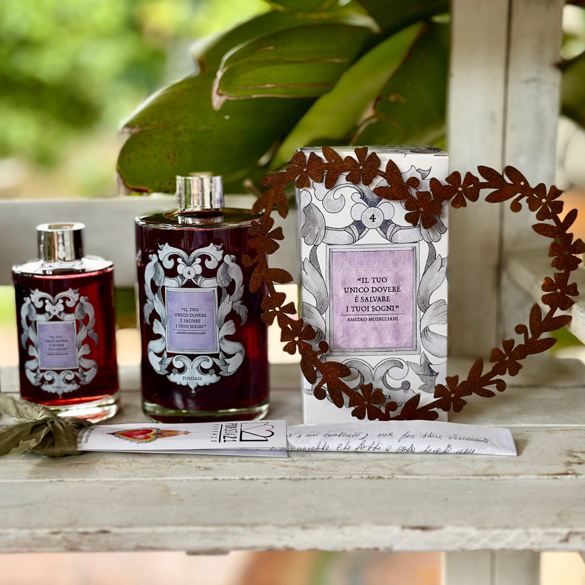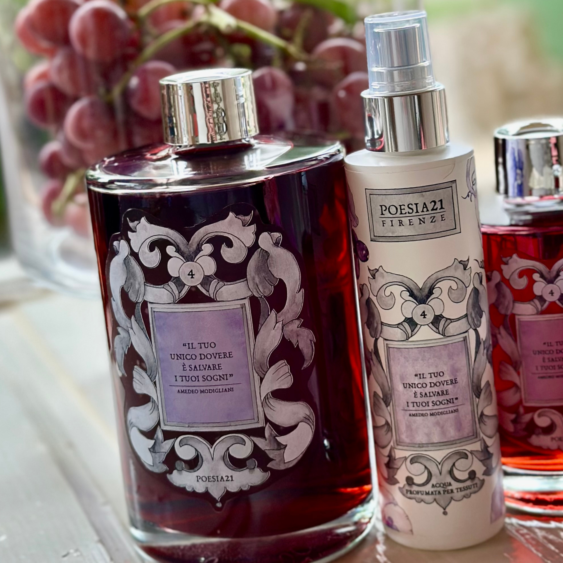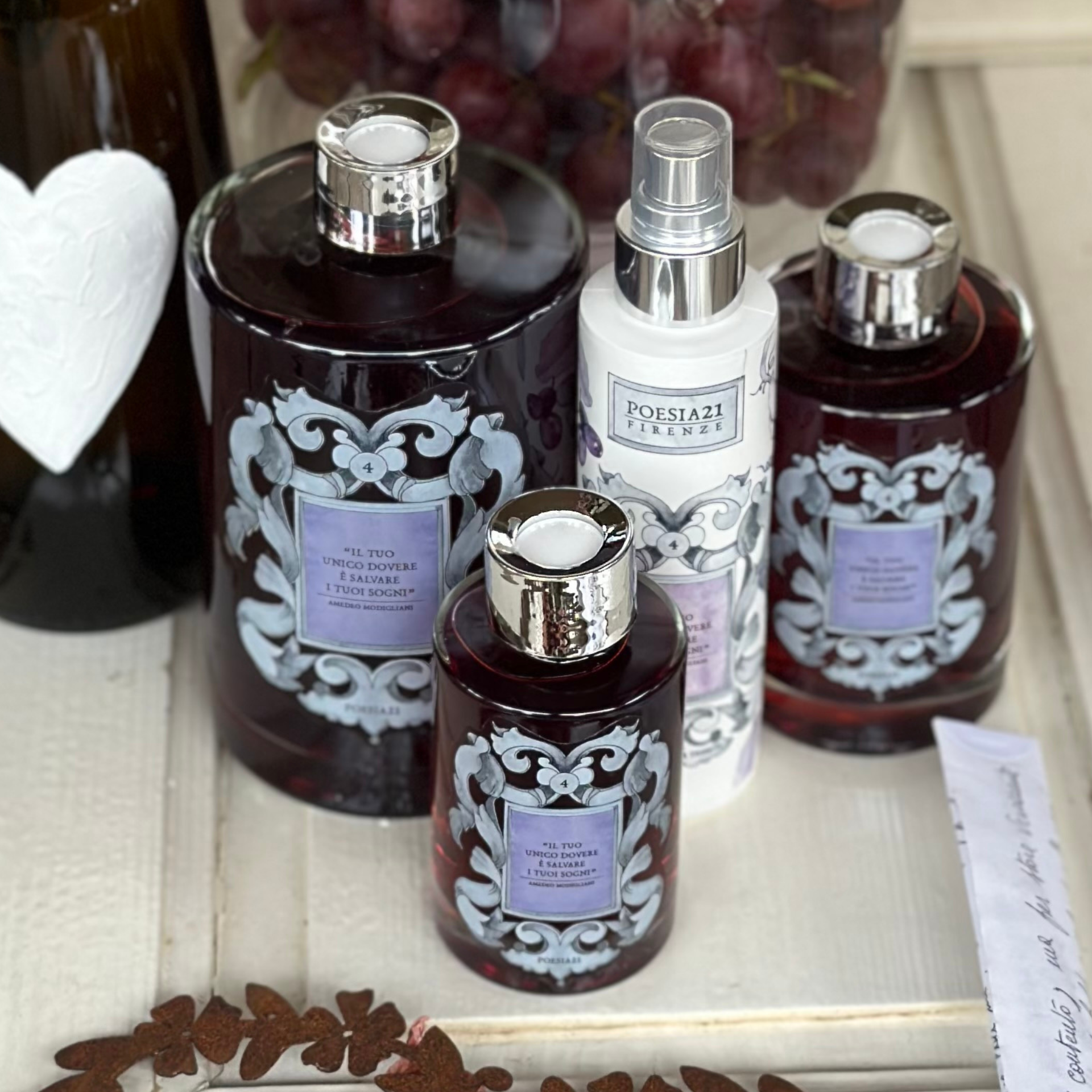 Un profumo rotondo e fiorito, dove le note di vino e di viola si uniscono in un’armonia calda e avvolgente. La dolcezza di questa fragranza evoca l’atmosfera serena della vendemmia toscana, il sole tiepido, l’odore dell’uva appena raccolta, la gioia condivisa.